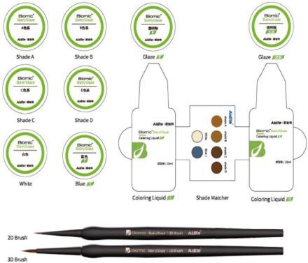 Set barviček na dobarvení CAD/CAM prací ze zirkonu a keramiky. Krásná translucence, imituje přirozené zuby. 2D barvy - střední viskozita, jednoduchá homogenní aplikace, barva se neroztéká. 3D barvy - vysoká plasticita, možnost upravit tvar výsledné práce nebo upravit kontaktní bod. Barvičky 2D a 3D lze míchat. Balení 2D barvy (Shade A, Shade B, Shade C, Shade D, Blue 1, White, Glaze-F), 3D barvy (3DN), Coloring liquid 1, Coloring liquid 2, 2D štetec, 3D štetec a 6barevná paletka.