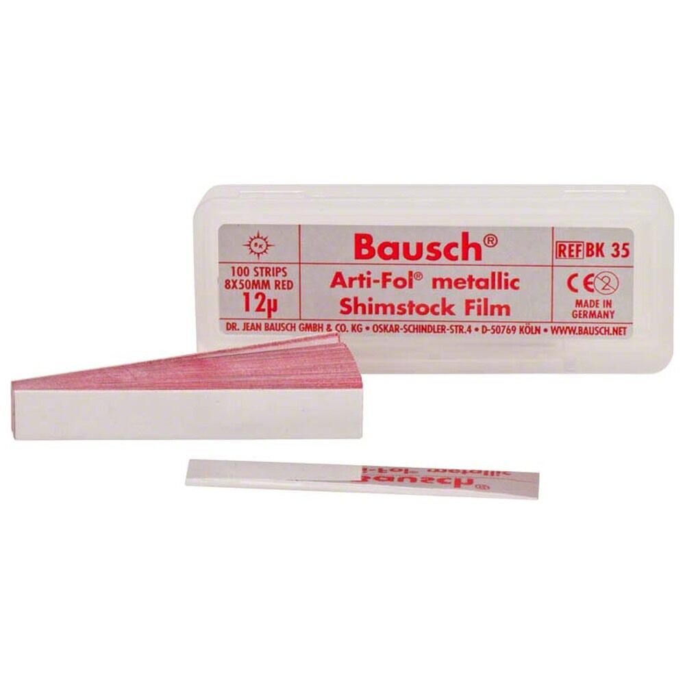 Ultratenká fólie 12µ na kontrolu okluzálního úseku. V zásobníku, jednostranná, červená, 100 proužků, 8 x 50 mm.