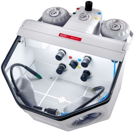 Profesionální pískovač od renomovaného výrobce vybavený 2 nádobami (možnost doplnit až na 4 nádoby). LED světlo 4800 lux, maximální pole vidění, speciální karbidové trysky se 4x delší životností. Homogenní tok abraziv nezávislý na množství v nádobě a pracovním tlaku. Jednoduché čištění. Velikost komory 20 l. Technologie IS (Immediate Stop) - okamžité zastavení toku písku.