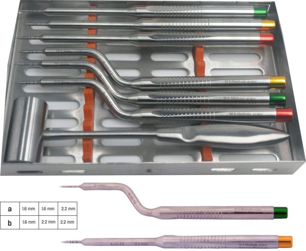 Sada 6 barevně značených dlátek na kost. Včetně sterilizační kazety a kladívka.