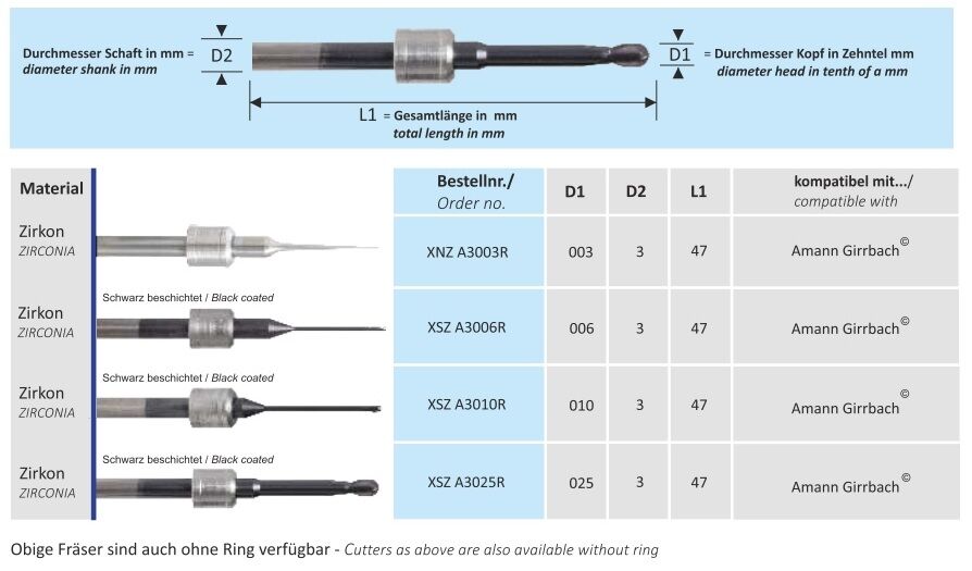 Fréza na zirkon, vosk a PMMA do frézovacích přístrojů Amann Girrbach. Vysoce kvalitní materiál zajišťující dlouhou životnost. Průměr 0,3 mm. Balení 1 ks.