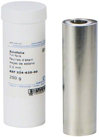 Tenká cínová fólie v roli. Vysoká čistota 99,9%. Rozměry: šířka 10 cm, délka 171 cm. Balení 250 g.