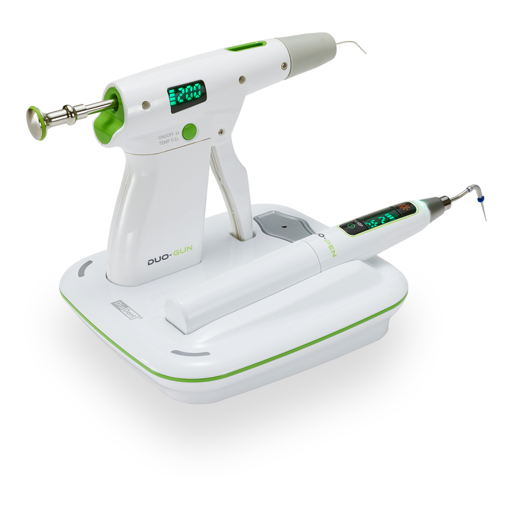 Dia-Duo je nově vyvinutý obturační systém s velice rychlým náběhem teploty. Balení Duo-Gun, Duo Pen + nabíječka, GP Tip 23G, Gutta per.