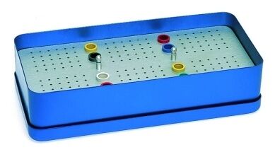 Hliníkový držák endodontických nástrojů - 180 otvorů. Rozměry 22 x 10,5 x 5 cm. Modrá barva.