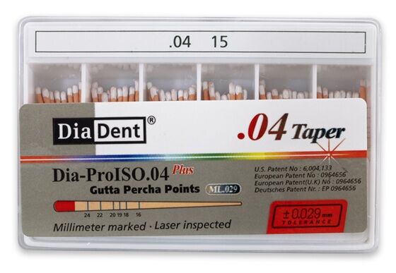 Kvalitní guttaperčové kalibrované čepy 4% vel. 15. Balení 60 ks.