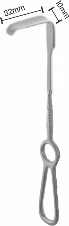 Dentální retraktor s dolů směřujícím koncem pro lepší kontrolu úchytu rtů.