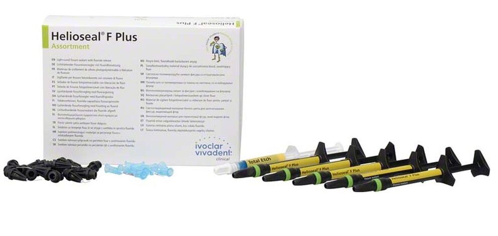 Inovovaný světlem tuhnoucí, bíle zabarvený materiál na pečetění fisur. Zkrácená doba expozice, postupné uvolňování fluoridů, vhodné pro děti. Aplikace z praktické stříkačky. Balení 5 x 1,25 g Helioseal F, 6 g Email Preparator blue, příslušenství.