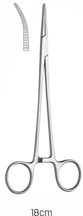 Multifunkční dentální nástroj např. pro odstraňování hrotů kořenů, uchycení volných předmětů nebo podchycení krevních cév. Délka 18 cm, zahnutý.