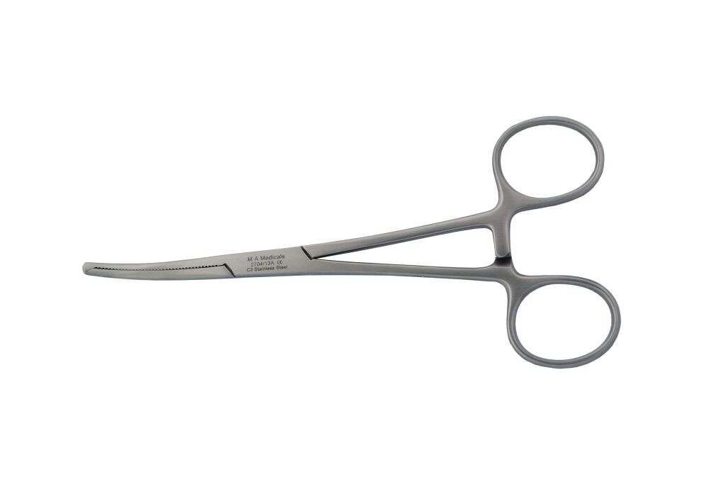Multifunkční dentální nástroj např. pro uchycení volných předmětů nebo podchycení krevních cév. Délka 13 cm, zahnutý.