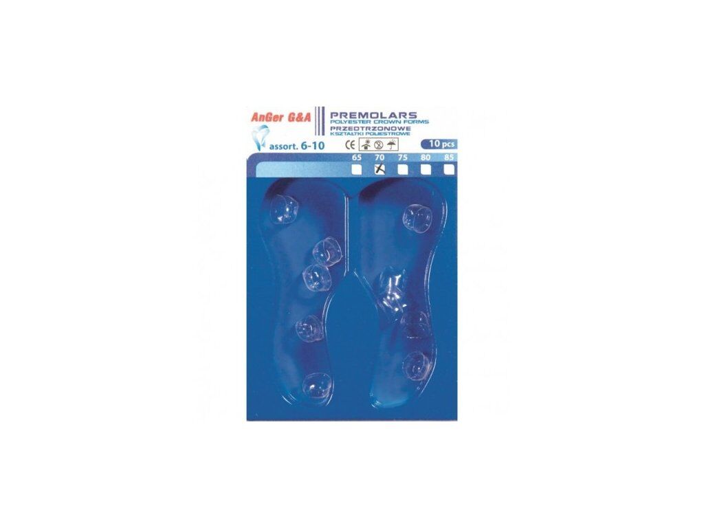 Polyesterové transparentní korunky na premolárové zuby. Balení 10 ks.