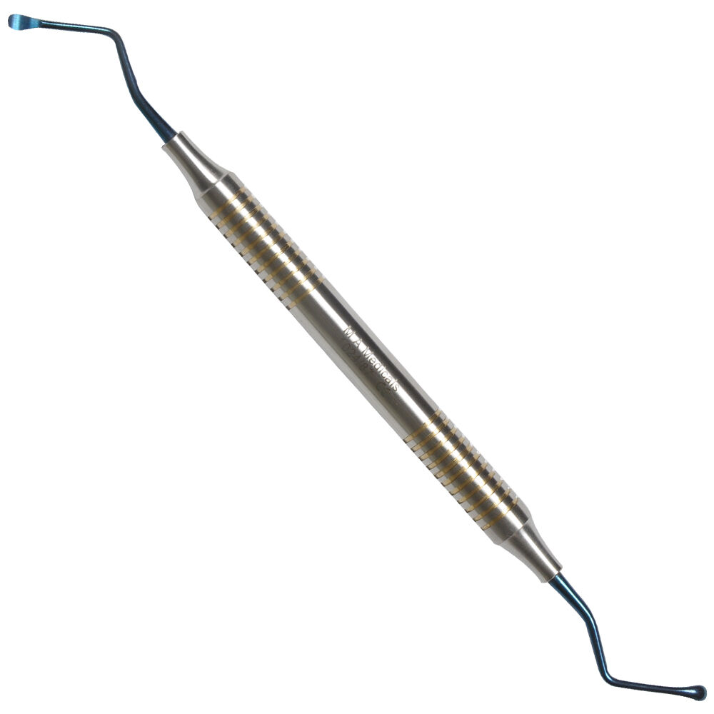 Chirurgická kyreta pro extrakci debrisu z extrakční rány. Pracovní části potažené titanovou vrstvou pro zvýšenou pevnost.