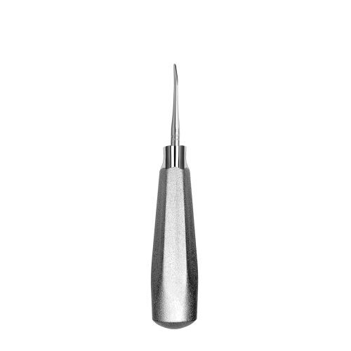 Zahnutý elevátor s tenkou ostrou čepelí na řezání periodontálních ligamentů.