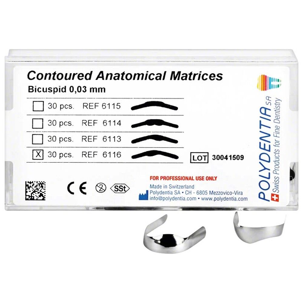 Jemné 0,03 mm tlusté konturované matrice s extenzí na zakrytí hrany krčku zubu. Balení 30 ks.
