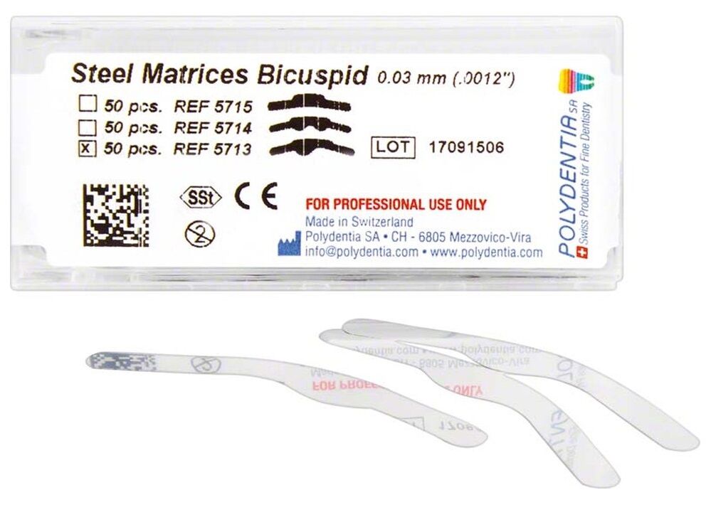 Anatomicky tvarovované nerezové matrice s tloušťkou jen 0,03 mm. Dvě verze: premolárové, molárové. Balení 50 ks.