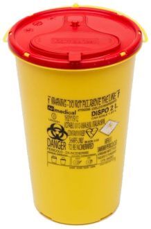Nádoby z ekologického plastu na použité jehly příp. jiný nebezpečný odpad. Hermeticky uzavřené nádoby. Průměr nádoby 9,8 cm a výška 22 cm.