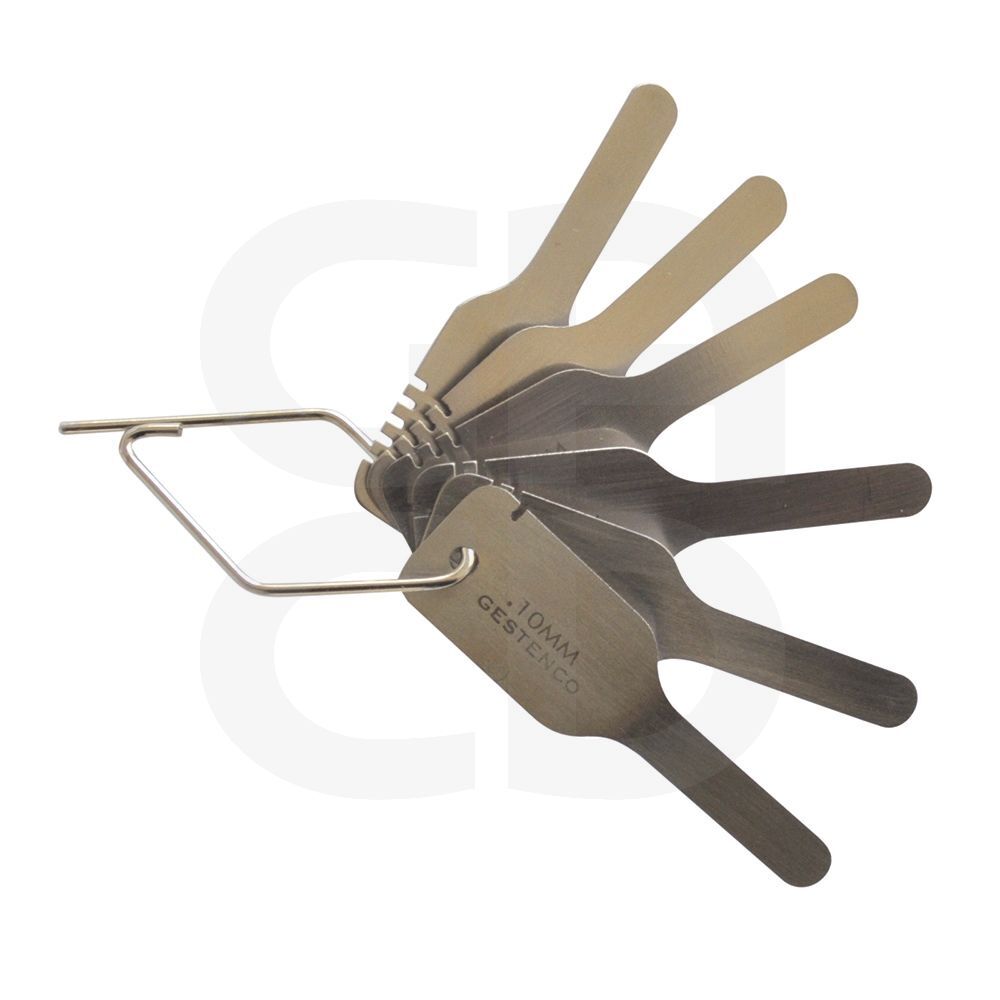 Nástroje pro měření mezery mezi zuby. Autoklávovatelné. Sada 6 měřidel (0,1 mm, 0,2 mm, 0,25 mm, 0,3 mm, 0,4 mm a 0,5 mm).