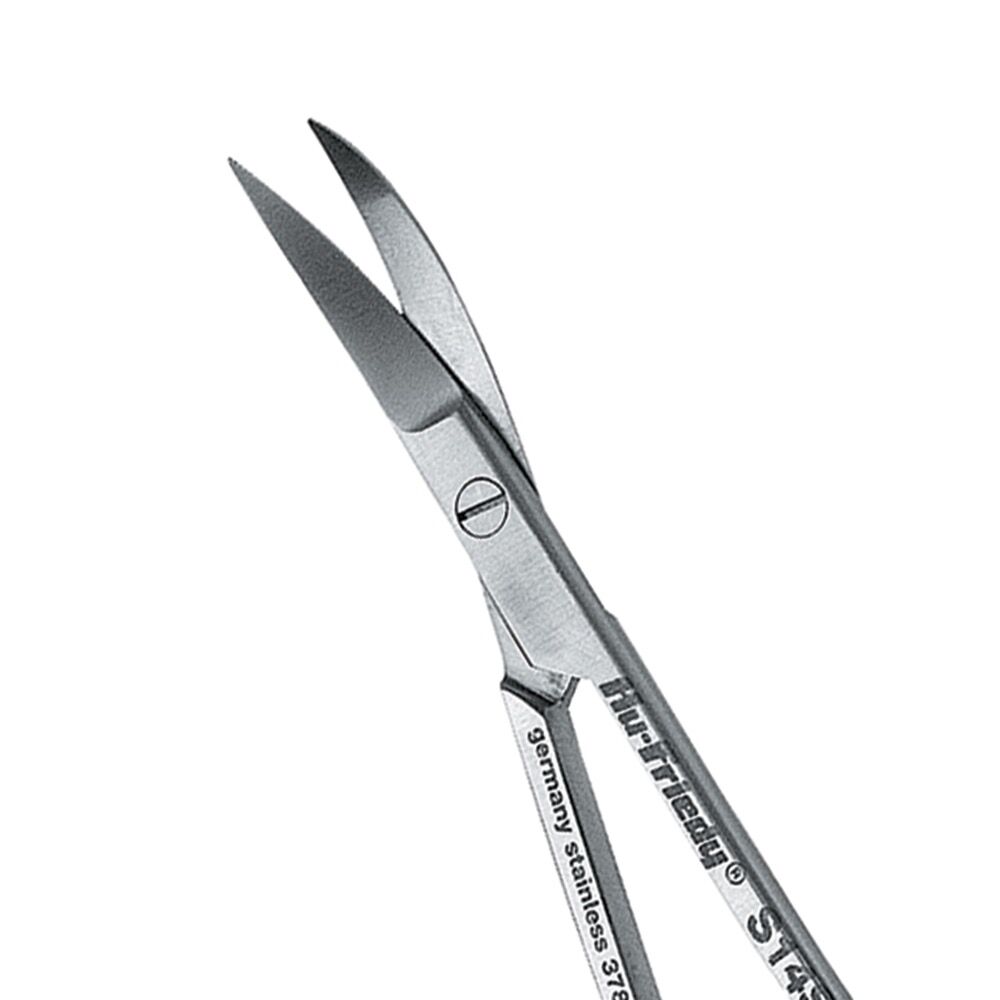 Nůžky s jedním rýhovaným břitem na zastřižení tkáně nebo odstřižení šití. Dvojitě zahnutý držák zlepšuje přehled a viditelnost. Délka 11,5 cm.