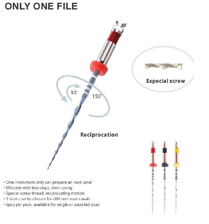 Reciprokační kořenové nástroje na strojní opracování kořenového kanálku. 2 až 3 x odolnější proti cyklické únavě než konkurenční nástroje a o 30% flexibilnější. Barevné označení: R25 červené, R40 černé, R50 žluté. Balení 6 ks.