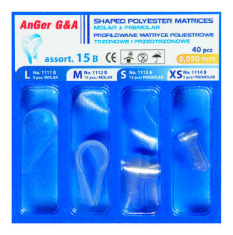 Transparentní tvarované polyesterové matrice o tloušťce 0,05 mm na premoláry nebo moláry. Balení 40 ks.