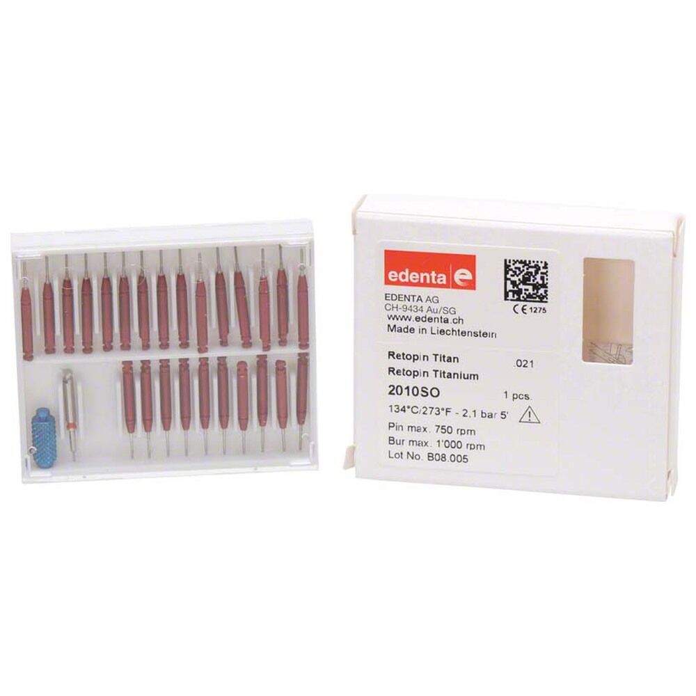 Titanové parapulpální čepy pro fixaci amalgamových a kompozitních výplní, snadná manipulace - jedna velikost použitelná na téměř všechny indikace (0,6 x 4 mm), opakovaně použitelné mandrely, pro strojové i ruční použití. Balení 25 ks Retopin Titan s mandrely, 1 vrták, 1 zavaděč.