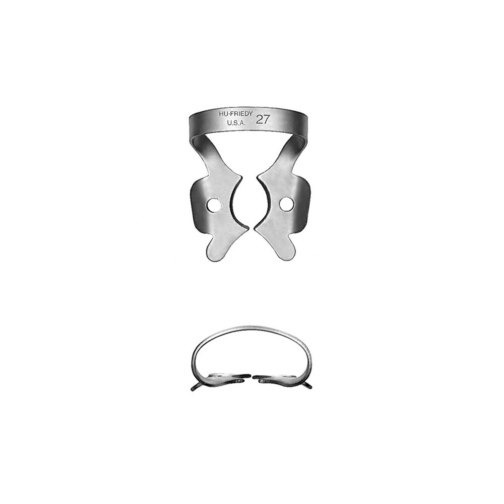 Spona na kofferdam k udržení suchého operačního pole při aplikaci kompozitních výplní.