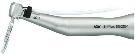 Implantologické kolénko s redukcí 20:1. Tlačítková hlavička, tělo z ušlechtilé oceli, externí i interní chlazení. Povrch DURAGRIP. Zlepšený přehled pracovního pole díky zmenšené hlavičce o 2 mm.