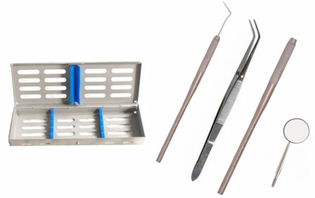 Balení 4 nástroje + 1 sterilizační kazeta z nerezové oceli.