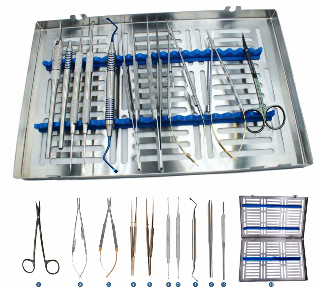 Micro surgery kit Micro surgery kit, obsahuje 10 instrumentů + sterilizační kazetu. 1613 Sterilization cassette for 20 instrument with removable top 3013B La-Grange suture scissor, black titanium coated, 13cm - TC 3052 Barraquer / Gingiva scissor, 15cm - TC 1280-4 Buser, periosteal elevator 1280-6 Zucchelli, periosteal elevator 2652-18 Castroviejo needle holder, 18cm – TC 2209-1 Micro surgery tweezer, 18cm (1x2) 2209-3 Micro surgery tweezer, 18cm, anatomic 1028 Scalpel handle 1034 Mirror handle, titanium coated, hollow-8mm 1001F Rhodium/Front Surface Mirror O22mm – no. 4 1061-87 Lucas 87