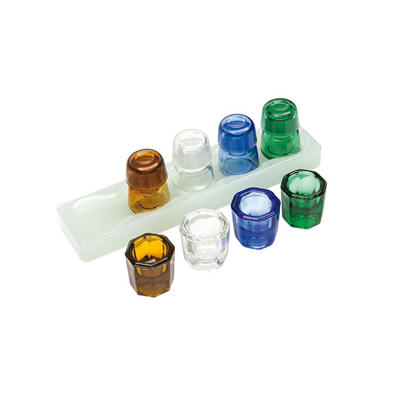 Stojánek na skleničky s víčky pro přehledné, úsporné a hygienické dávkování tekutých léčiv.