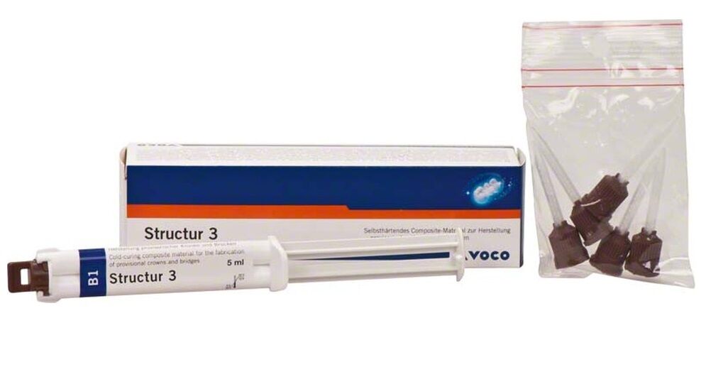 Samotuhnoucí kompozitní materiál na provizorní korunky. Krátká doba tuhnutí, přirozený vzhled díky lesklému povrchu, vysoká pevnost v tlaku a vynikající odolnost vůči zlomení pro odolné provizorní náhrady, 8 odstínů. Balení 5 ml QuickMix stříkačka, míchací kanyly typ 10.