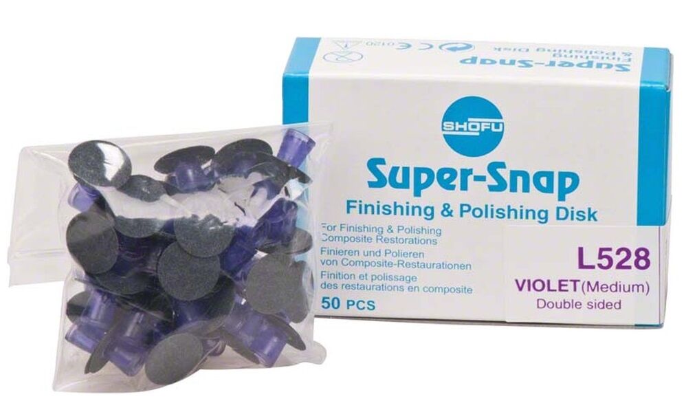 Super-Snap je dokončovací a leštící systém pro rychlejší a efektivnější konturování, finírování a leštění kompozitních výplní. Oboustranně potažené kotoučky (červený, zelený, fialový) pro rychlé vyleštění bez otočení nebo výměny, kotoučky nemají kovový střed, tudíž nepoškrábou a nezbarví kompozity. Balení 50 ks.
