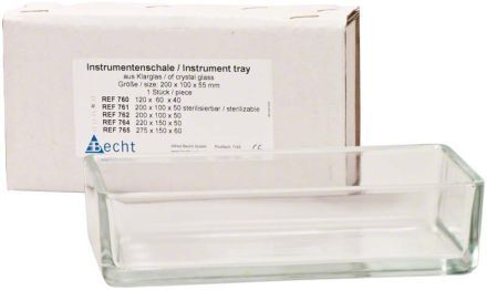 Tácek na nástroje z transparentního skla. Rozměr 200 x 100 x 50 mm. Autoklávovatelný.
