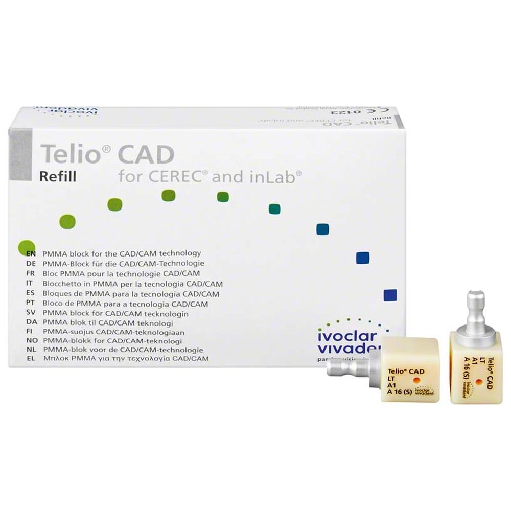 Bločky Telio CAD se používají k CAD/CAM výrobě dlouhodobých provizorních náhrad (maximální doba intraorálního použití: 12 měsíců). Náhrady se z Telio CAD frézují buď v zubní ordinaci (např. CEREC/Sirona) nebo v zubní laboratoři (např. inLab/Sirona). Alternativně je možné nechat náhrady z Telio CAD vyrobit ve frézovacím centru (např. NobelProcera/Nobel Biocare). Náhrady lze rychle a efektivně leštit nebo individualizovat pomocí barviv. Kromě toho je možné individualizovat incize náhrad nanesením světlem tuhnoucích materiálů nebo materiálů Telio Lab, a docílit tak vysoce estetických výsledků. Výhody: Trvalá stabilita odstínů a přirozená fluorescence. 6 odstínů (BL3, A1, A2, A3, A3.5 and B1). Telio CAD pro CEREC a bločky inLab k dispozici ve 2 velikostech (B40L, B55). Vysoce homogenní materiál díky procesu průmyslové výroby. Provizorní náhrady lze velice snadno reprodukovat. Balení 9 ks.