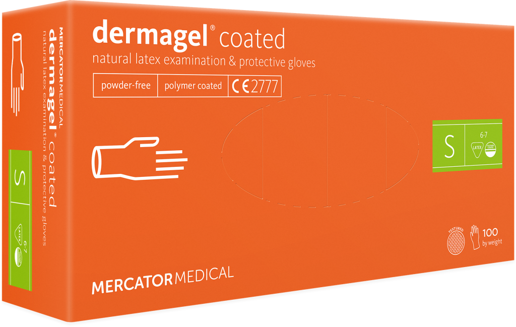 Vyšetřovací rukavice dermagel® coated jsou univerzální rukavice vyrobené z přírodního latexu. Vnitřní polymerová vrstva usnadňuje navlékání i na vlhké ruce. Balení 100 ks.